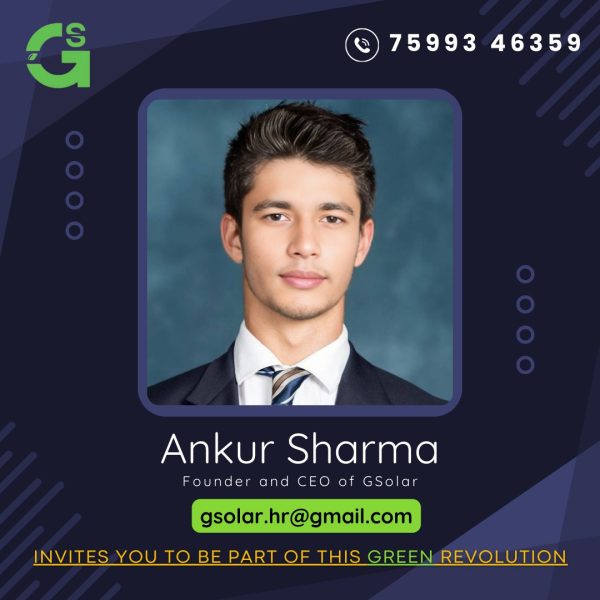 Ankur Sharma is the founder of Gsolars. The founder of Gsolars, has been a trailblazer in the renewable energy sector. with a passion for sustainable solutions, Ankur estalished Gsolars to provide innovative solar energy solutions that empower individuals and bussinesses alike. His commitment to eco-friendly practices and dedication to cutting-edge technology have positioned Gsolars as a leader in the industry. under his guidance, the company has achieved remarkable growth while promoting environmantal awarenwss and energy efficinecy. Ankur’s entrepreneurial spirit and leadership continue to inspire manyin the quest for a greener future.
